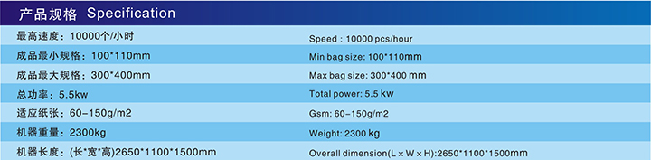 氣吸式紙堆底部給紙機構分紙可靠,并可不停機續(xù)紙。配有吸氣滾筒的柵欄定位折疊機構高速穩(wěn)定,折疊準確??刹煌C調整信封(紙袋)的寬度,輪轉施膠機構可保證膠量均勻,清洗方便,配有成品計數(shù)分組機構。